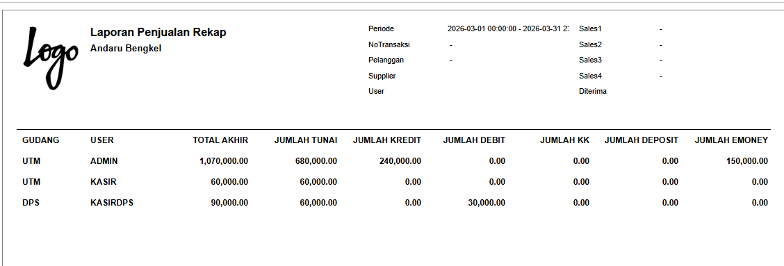Analisis Hasil: Laporan ini akan menampilkan kolom Gudang (Cabang), User, Total Akhir, serta rincian pembayaran (Tunai, Kredit, Debit, KK, Deposit, dan E-Money) secara otomatis dalam satu tabel ringkasan.